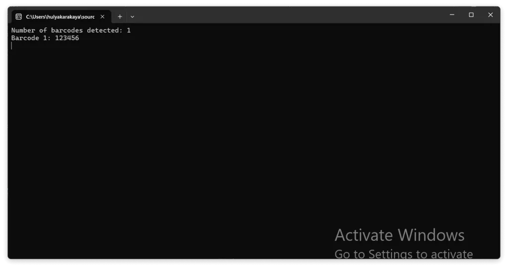 // Output barcode scanning resultif (barcodeCount > 0){ Console.WriteLine($"Number of barcodes detected: {barcodeCount}"); for (int i = 1; i <= barcodeCount; i++) { string barcodeValue = gdpictureImaging.Barcode1DReaderGetBarcodeValue(i); Console.WriteLine($"Barcode {i}: {barcodeValue}"); }}else{ Console.WriteLine("No barcodes detected.");}